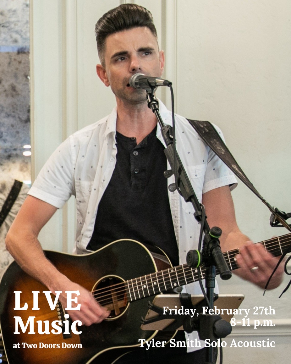 Tyler Smith returns to the Two Doors Down stage on Friday, February 27th. Join us for great live music, food, and drinks! (No cover charge.)